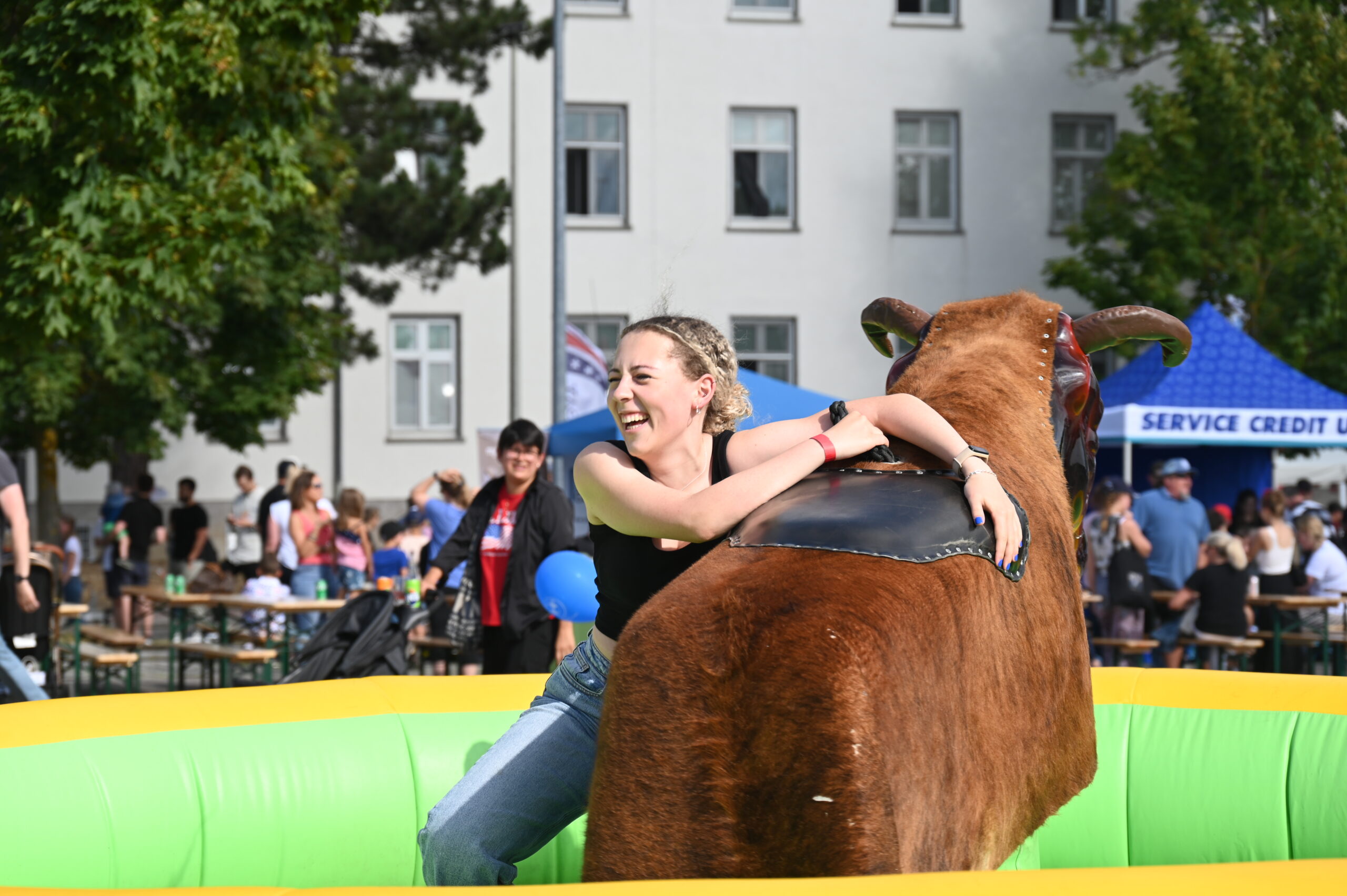 A range of activities kept visitors entertained from a temporary tattoo booth to a dreaded ride with the mechanical bull. Rock climbing, bungee jumping, and even a series of water events drew lines of Germans and Americans alike. Many attendees even commemorated the historic day with a family picture at the photo booth.