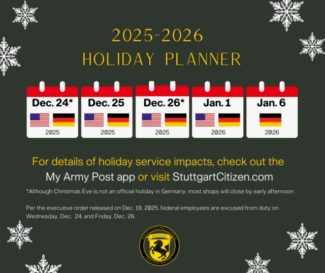 Dec. 26 and Jan. 6 are also public holidays in Baden-Württemberg, with some on-post services staffed largely by local national professionals closed or adjusted as a result. Service adjustments due to local national holidays are listed in the My Army Post App.