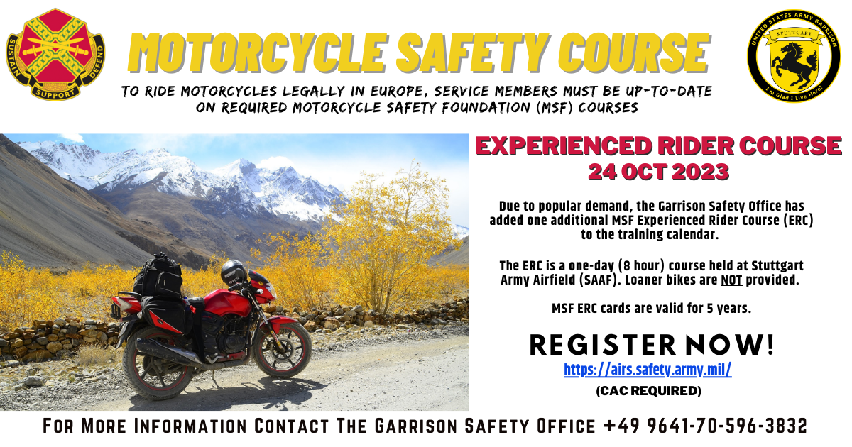 The Experienced Rider Course (ERC) is a one-day (8-hour) course held at the Stuttgart Army Airfield.