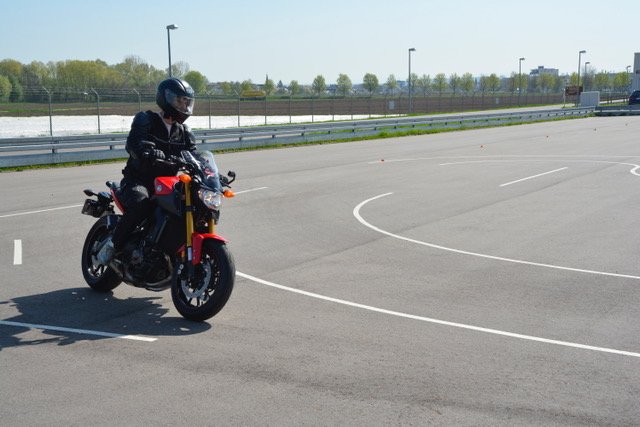 A rider navigates the motorcycle safety course at Stuttgart Army Airfield. Photo by USAG Stuttgart Public Affairs