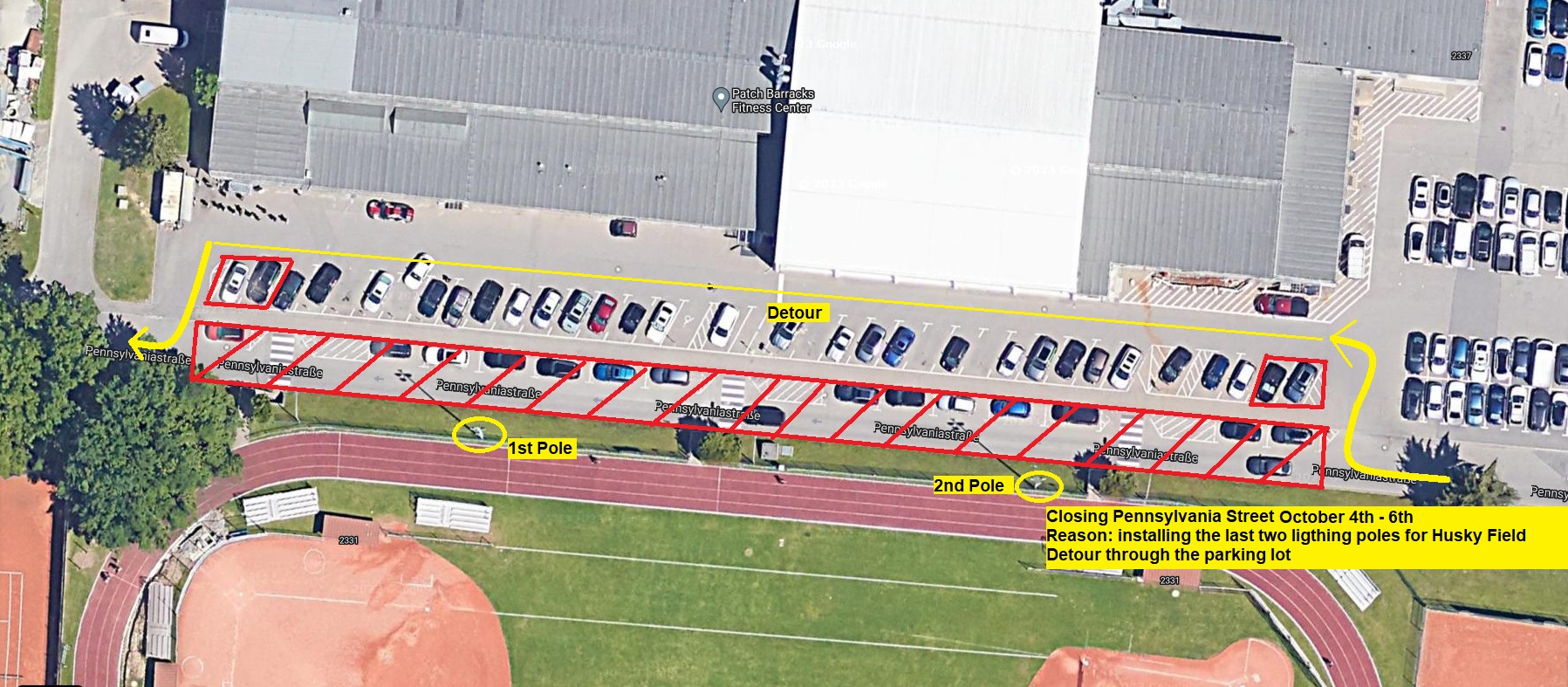 The reason for this road closure is the installation for the last two lighting poles on Husky Field.