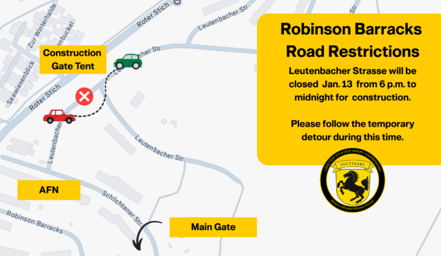 Leutenbacher Strasse on Robinson Barracks will be fully closed on Tuesday, Jan. 13, from 6 p.m. to midnight near the Grenadier duty bus stop for ongoing construction work. Drivers are advised to avoid the area, if possible, and follow all posted detour signs if they must drive near the construction zone.
