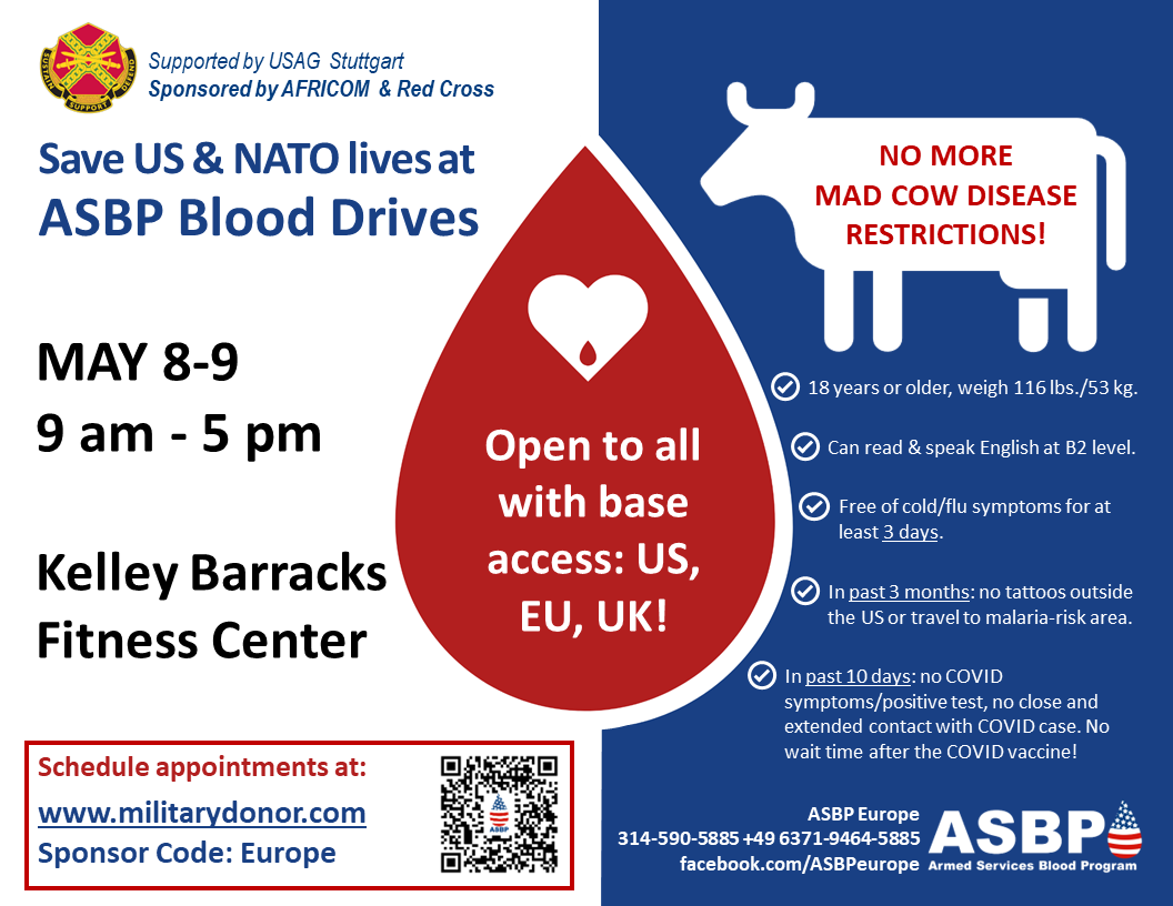 The blood drive will take place May 8-9 from 9 a.m. – 5 p.m. at Kelley Barracks Fitness Center. And we have some good news too, there are no more mad cow disease restrictions!
