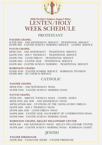 U.S. Army Garrison Stuttgart’s Religious Support Office has set the spring holiday schedule for Protestant, Catholic and Jewish services across all installations. Please see the schedule above for details. For more information, contact the Religious Support Office at DSN: 314-596-3076 orejiroghene.j.okosun.ln@army.mil.
