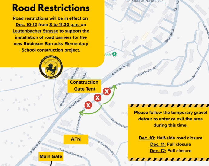 Temporary road restrictions will be in effect on Leutenbacher Strasse on Robinson Barracks from Dec. 10 to 12. Please follow all posted detour signs during this time.Read More