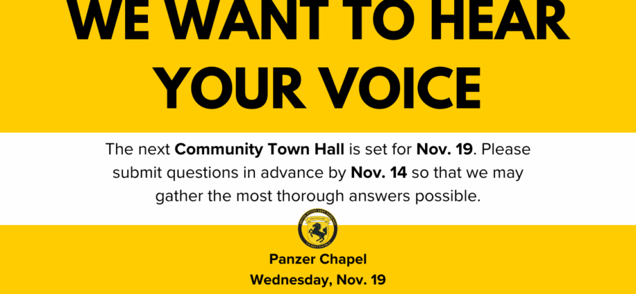 The garrison command team and representatives from all directorates will be at the Panzer Chapel on Nov. 19 at 6 p.m. for an open community discussion. Please submit your questions by Nov 14. Read More