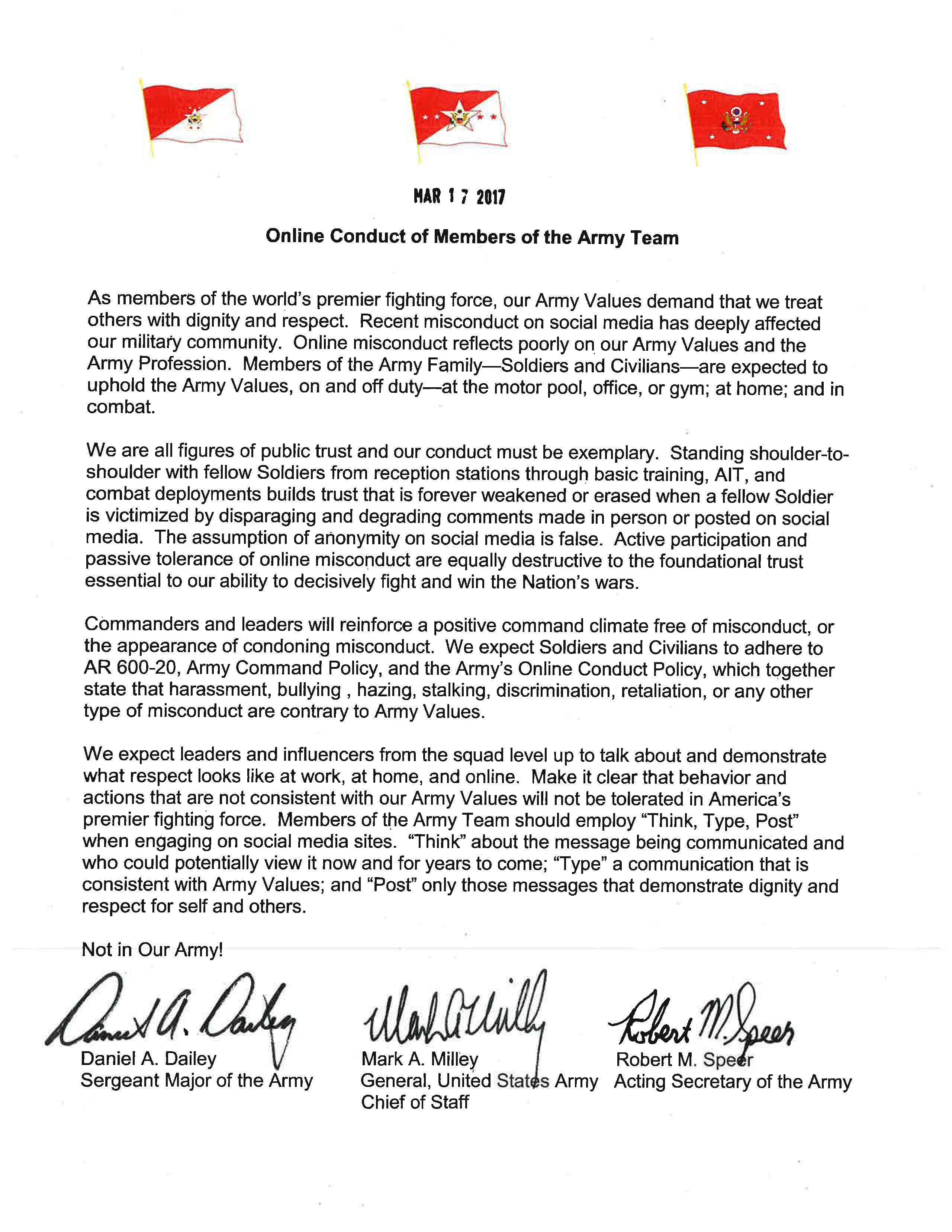 In a message to all Army personnel dated Feb. 23, Soldiers and Army civilians were reminded that the Army is a values-based organization. Soldiers are to conduct themselves according to Army Values; whether in person or online, everyone is to be treated with dignity and respect.
