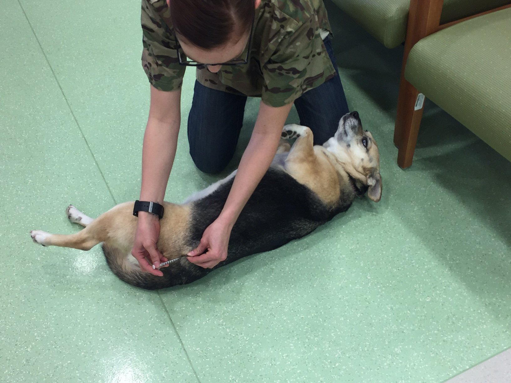 Four-legged customer Lucy demonstrates how easy it is to get a shot at the Stuttgart Veterinary Clinic.