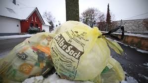 The city of Stuttgart uses three bins and the yellow sack, or gelbe sack. A black bin is for trash, a green bin is for paper, a brown bin is for organic waste and gelbe sacks are used for recyclables. Gelbe sacks are distributed free of charge at city halls and should only be left out on the curb the day before or day of collection.