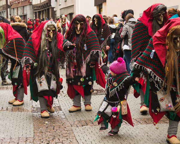 During the various Fasching parades in Southern Germany, Narren, or Fasching fools, will be seen with wooden masks in the images of witches, devils and grotesque animals. In Swabia and Southern Germany, the costumes are called “Häs.” Be on the lookout for Narren, who will walk up to you and either ruffle your hair, paint your face, take away a hair band or drop you a piece of candy.
