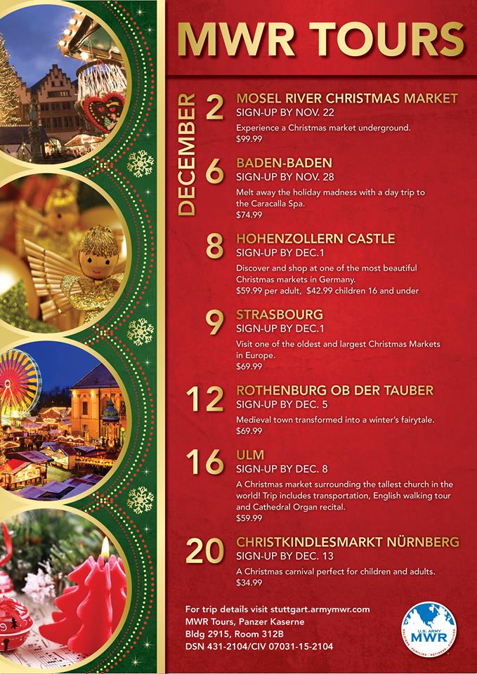 Dec. 9-10: The “Engelesmarkt,” or angel’s market, is located at “Neuer Markt” in downtown Leinfelden. The market features a holiday concert and choir performance Dec. 9 at 3 to 9 p.m. Small booths offer arts and crafts, food and homemade baked goods. The market is open Dec. 10 from 11 a.m. to 6 p.m.