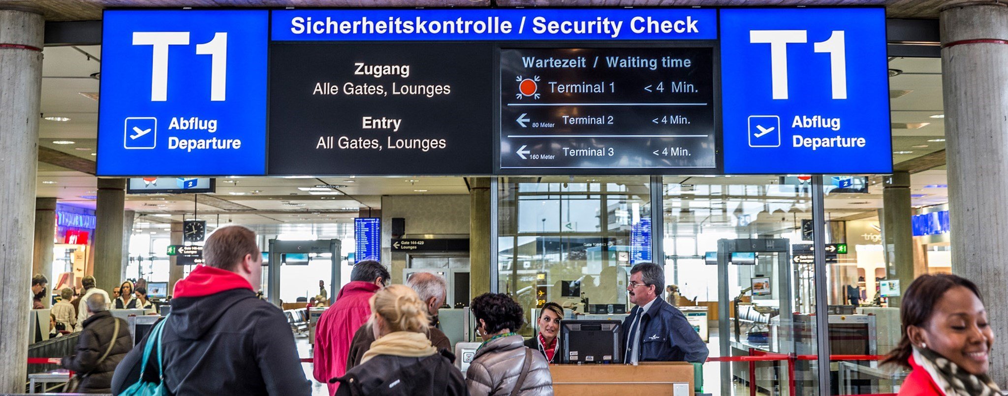 Passengers must undergo a security check prior to moving to their gate. Security personnel will check you for metal objects with a detector. Your handbag and hand baggage are checked in an X-ray machine. Place your coat or jacket and any objects containing metal (e.g. keys or loose change) in the containers provided – this will speed up your inspection. And make sure you are not in possession of prohibited articles. Please note that any notebook, video camera or photo camera in your possession will be subject to close examination.