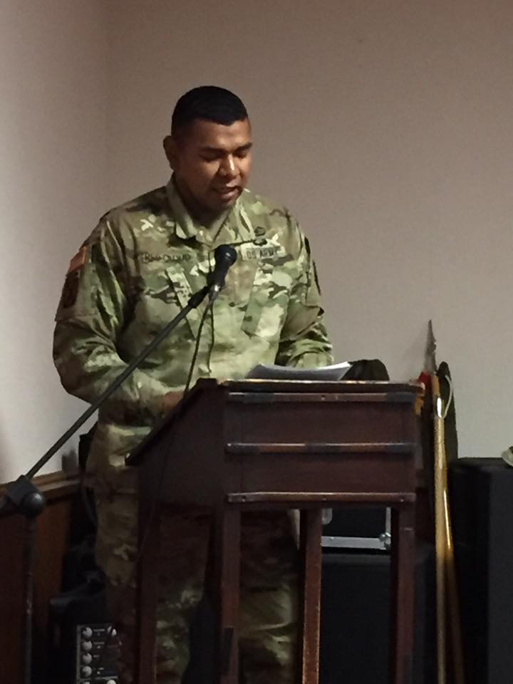 Staff Sgt. Lionell D. Red Cloud, a member of the Oglala Sioux Tribe from South Dakota and current Military Police officer speaks about his heritage at the National American Indian Heritage Month ceremony, Nov. 15, 2016 on Kelley Barracks, Stuttgart, Germany. By Holly DeCarlo-White