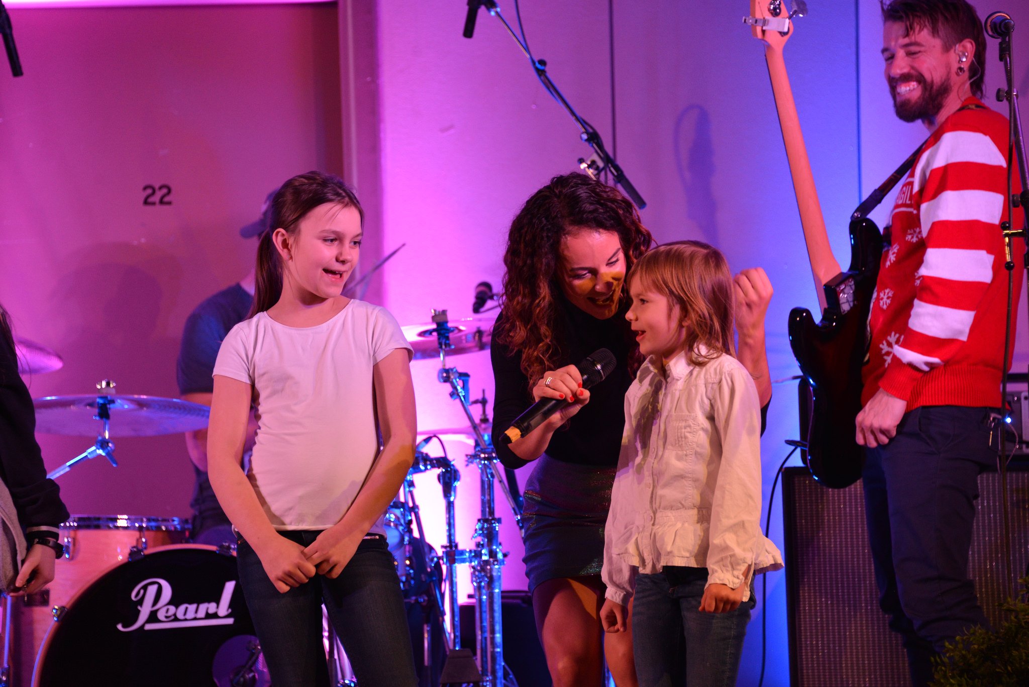 Danika Portz sings with Stuttgart community youth on stage during a free Armed Forces Entertainment concert performance on Path Barracks, Nov. 30, 2017. Photo by Larry Reilly