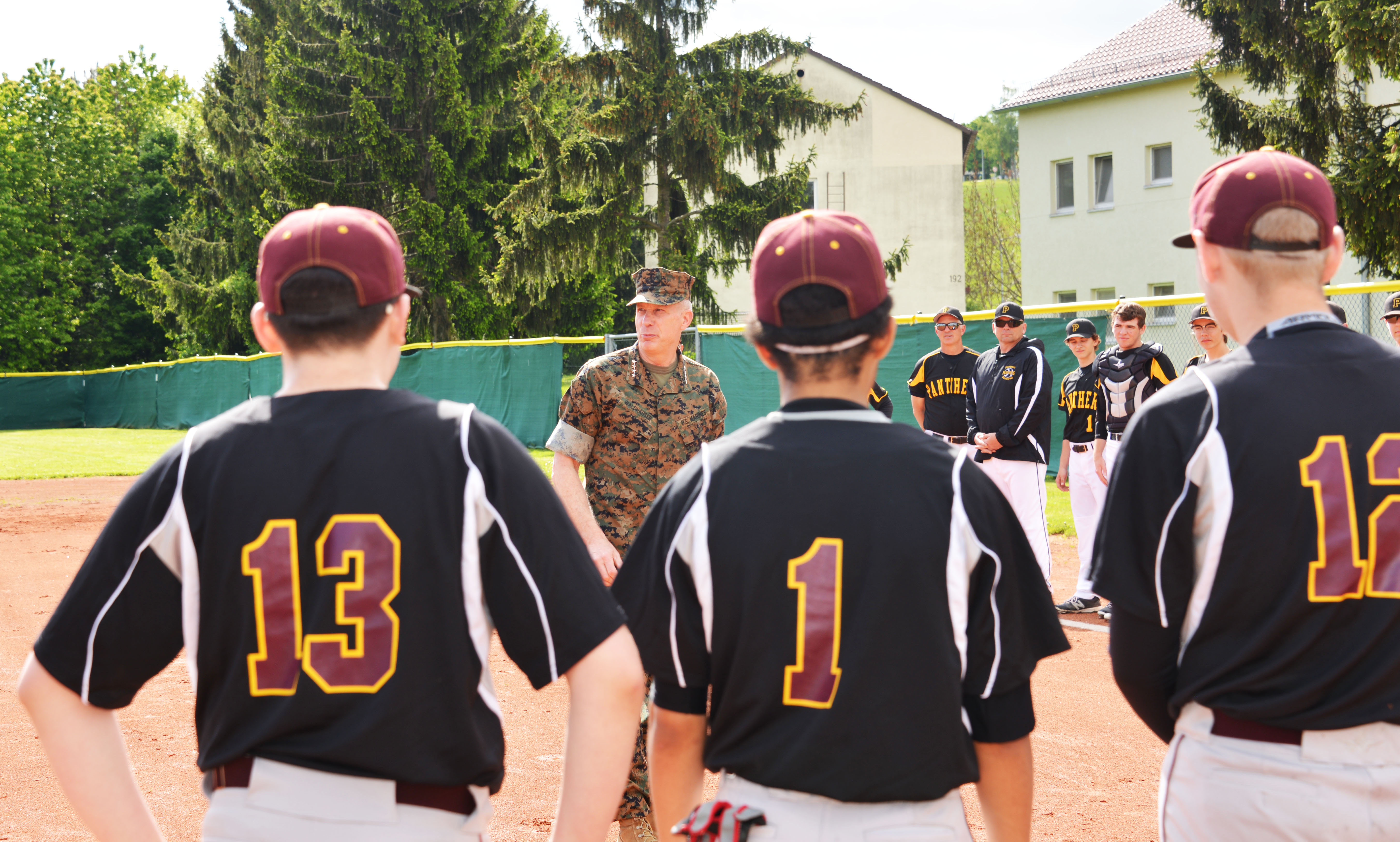 Marine Corps Gen. Thomas D. Waldhauser, commander, U.S. Africa Command, addressed the teams before the doubleheader and threw the first pitch.