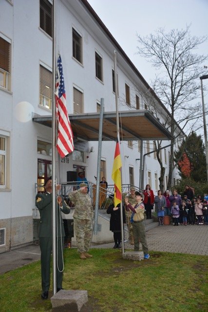 U.S. Army Garrison Stuttgart Headquarters and Headquarters Company 1st Sgt. Anthony Hopkins and retired 1st Sgt. James Terrell, wearing his Class A uniform from when he retired 22 years ago, raised the American flag as the student sang the National Anthem and recited the Pledge of Allegiance.