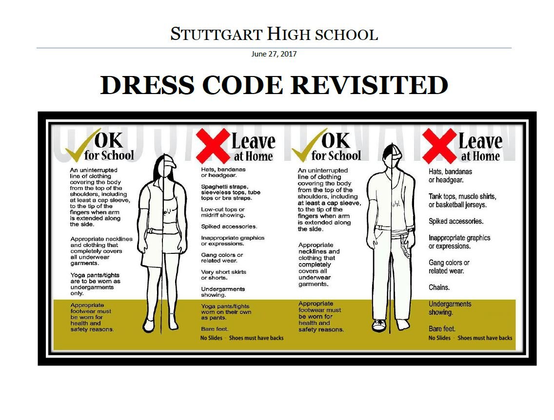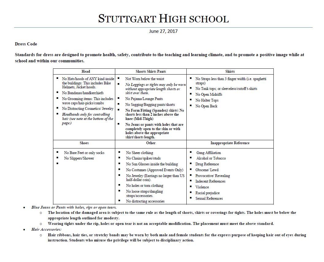 At Stuttgart High School we do our best to ensure that all of our stakeholders have a voice in any policy or expectations that are set by the school. Since our beginning, we have worked with our local community to establish clear parameters for dress during school and school sponsored events.