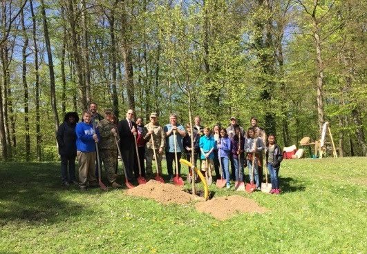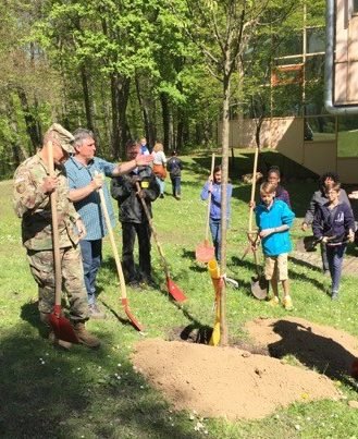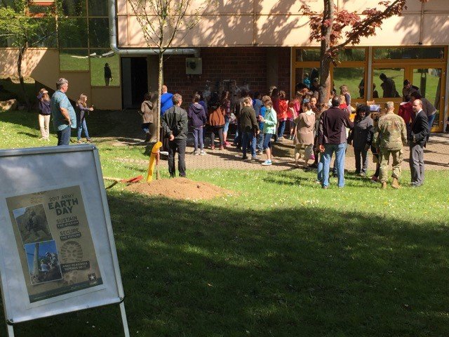 Earth Day is celebrated by a tree planting ceremony featuring Waldmeister Andreas Ganz and garrison commander Col. Glenn K. Dickenson, left, at Patch Middle School, May 10, 2017. Photo by John Reese, USAG Stuttgart Public Affairs