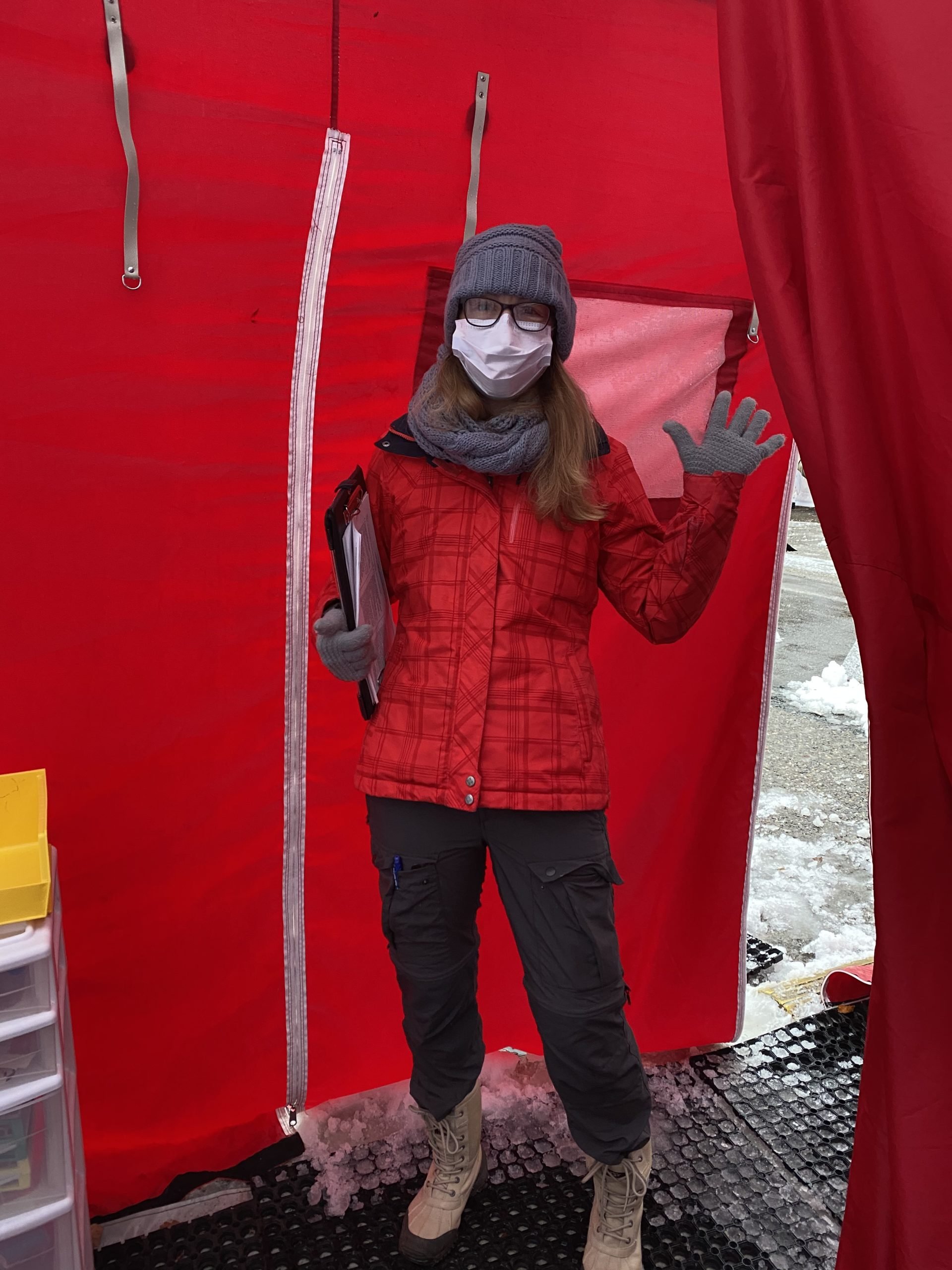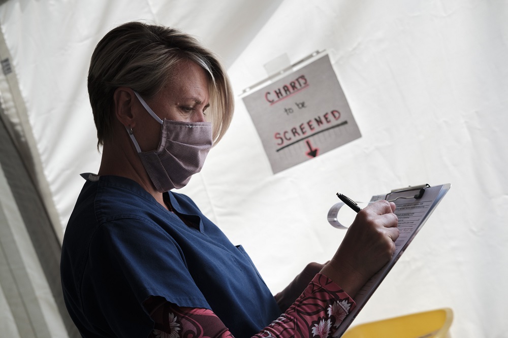 Hope Zak, a nurse practitioner volunteering through the Red Cross at the Stuttgart Army Medical Clinic, fills out paperwork to screen drive thru visitors, April 24, 2020. Zak, who recently arrived from the states where she worked in urgent care, said this is her first time working with the military. U.S. Army photo by Staff Sgt. Thomas Mort.